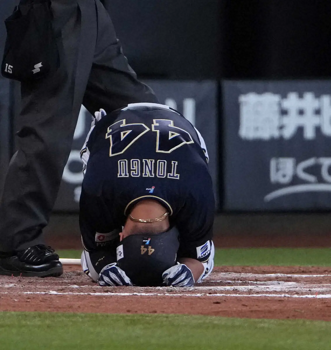 9回先頭で日本ハム・田中正が初球に投じた直球が、左手首付近に直撃。頓宮はその場に倒れ込んで悶絶し、即座に代走・山足が送られた。