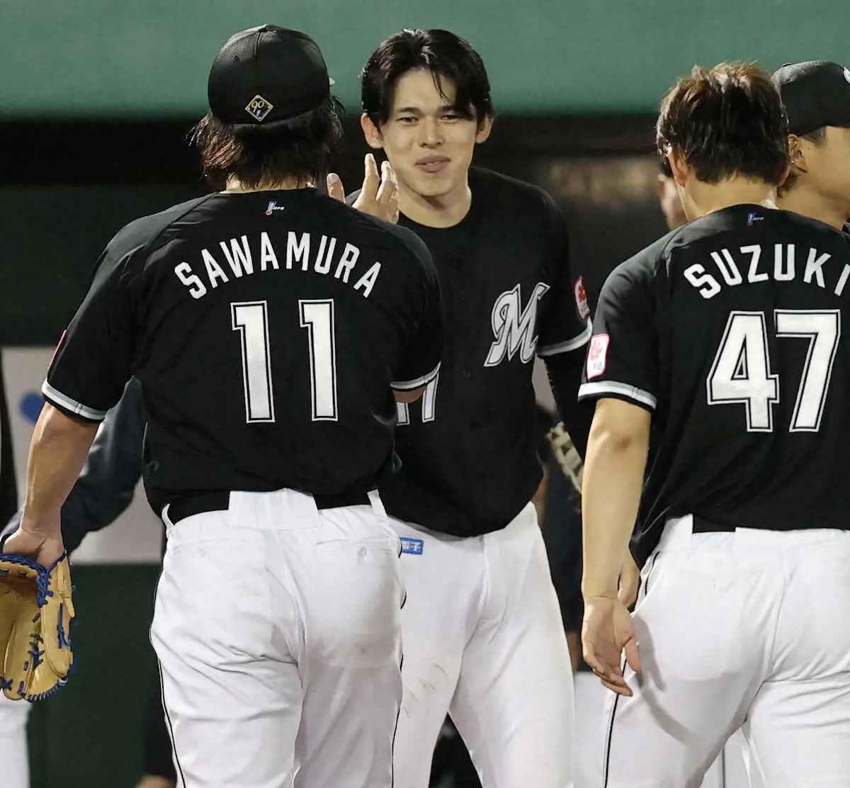<オ・ロ>8回2死一、三塁、好救援を見せた沢村(左)を出迎える佐々木(撮影・北條 貴史)