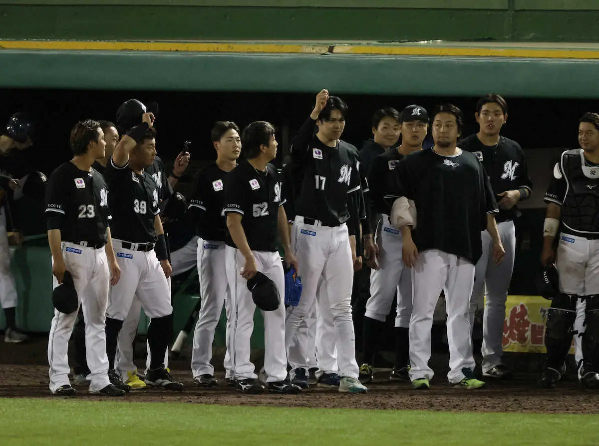 <オ・ロ>スタンドのファンにあいさつするう佐々木朗らナイン(撮影・長久保 豊)