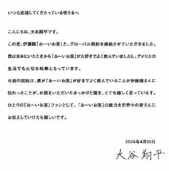 大谷も直筆の署名入りでメッセージを寄せた。「この度、伊藤園『お~いお茶』とグローバル契約を締結させていただきました」と報告。