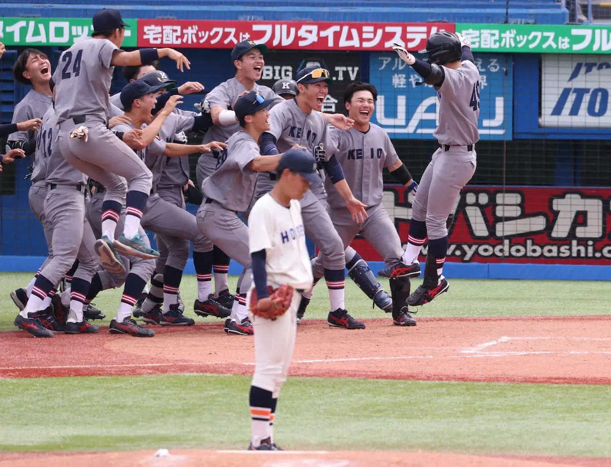 「KEIO」が107年ぶりに甲子園を制した夏から250日。渡辺憩が再び歴史の扉を開いた。引き分け寸前だった延長12回1死走者なしから代打で初出場。カウント3―1から外角高め直球を捉えると、左翼手は一歩も動くことなく頭上の打球を見送った。白い歯を光らせダイヤモンドを一周。本塁付近で仲間からの手荒な祝福が待っていた。