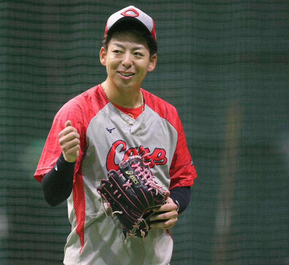 笑顔を見せる広島・野間(撮影・平嶋 理子)