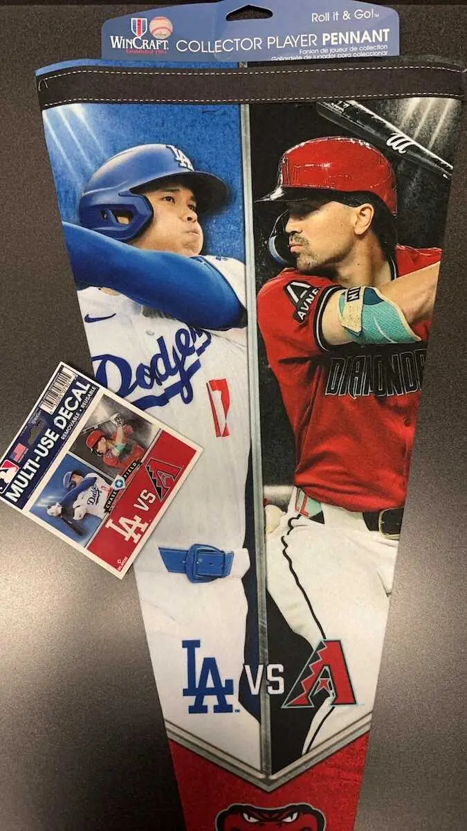ドジャースとダイヤモンドバックスの3連戦で昨季ア・リーグMVPのド軍大谷と昨季ナ・リーグ新人王キャロルのステッカー(7.99ドル=約1240円)とペナント(14.99ドル=約2320円)が販売されている。