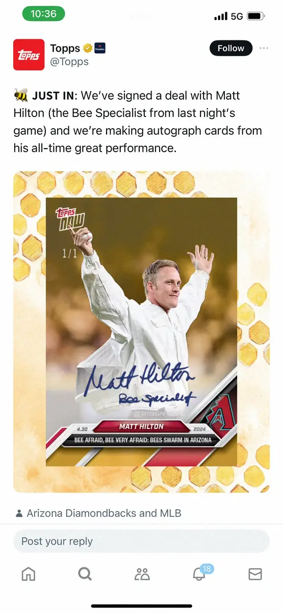 これを受け、トップス社は2日(日本時間1日)公式SNSで「マット・ヒルトン(昨夜の試合のビースペシャリスト)と契約を結び、彼の史上最高のパフォーマンスからサインカードを作成しています」とヒルトンさんのトレーディングカードを作成することを発表した。