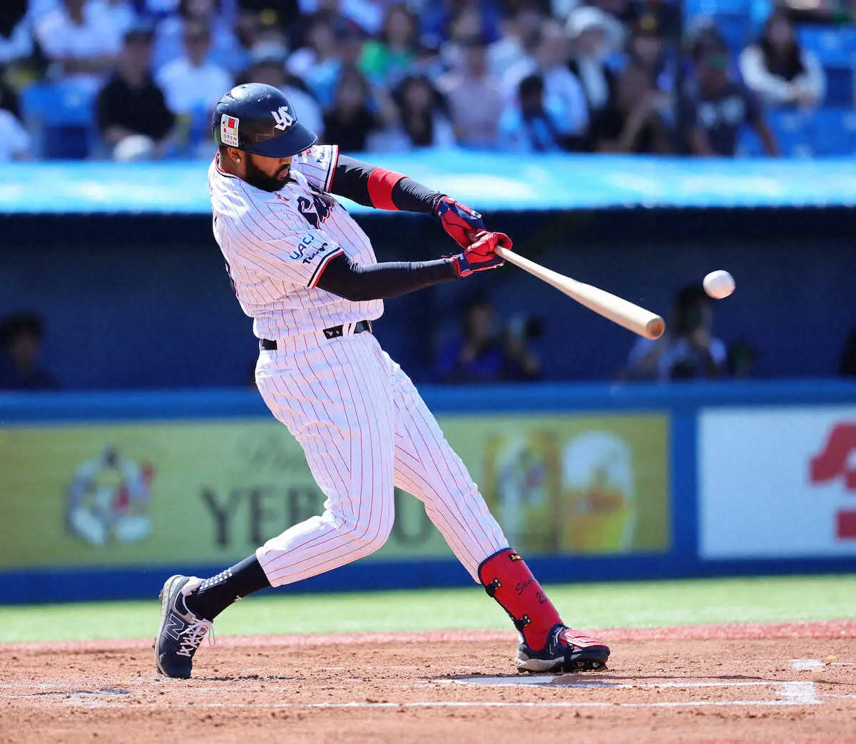<ヤ・中>初回、先制適時二塁打を放つサンタナ(撮影・尾崎 有希)