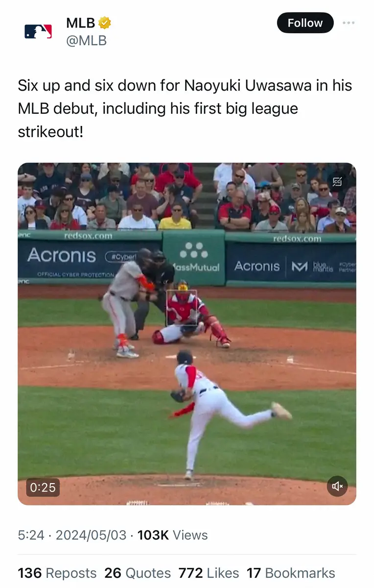 これを受けMLB公式Xは「上沢直之選手はMLBデビュー戦で6打席で6アウト、メジャー初奪三振を記録した」とつづり、上沢の投球の動画とともに投稿。フォロワーからも「興味深い」「ナオユキにとっての大きな一歩」「うれしい」と国内外からコメントが寄せられていた。