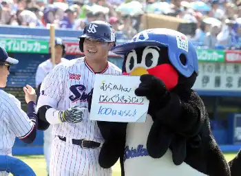ベンチでは、つば九郎も祝福。「むらかみくん じんぐうきゅうじょう 100ほーむらん!!」と手書きのボードを手に、村上とのツーショットを披露した。