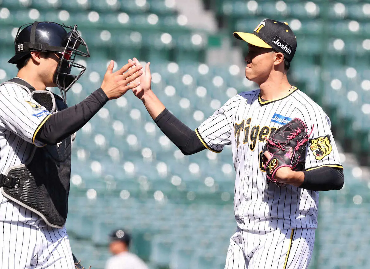 <ウエスタン 神・ハ>10回に登板した阪神・湯浅は3者凡退に抑え、栄枝(左)とタッチしてベンチに戻る (撮影・奥 調)