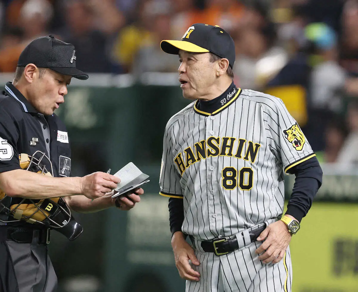 <巨・神> 選手交代を告げる岡田監督(撮影・大森 寛明)
