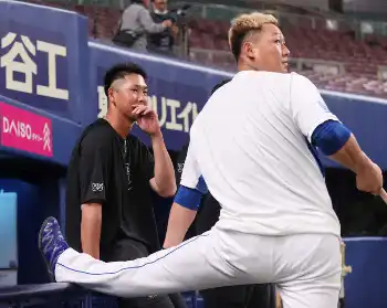 秋広は、中田の姿を見つけると、一目散に駆け寄りあいさつ。同じくこの日昇格した中田の大阪桐蔭の後輩であるドラフト4位・泉口とともに約20分間談笑した。