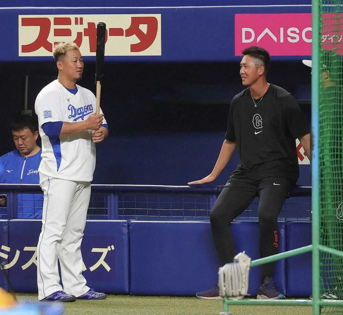 中日の中田翔内野手(35)が7日、巨人戦(バンテリンD)前に巨人時代に自主トレをともにするなどした“弟分”の巨人・秋広優人内野手(21)と再会した。
