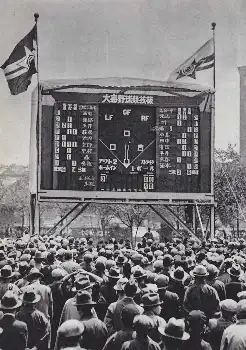 そのうち「満員札止め」で入場できず、場外に人があふれるようになった。来場できない人びとのために、場外に試合の模様を伝える速報板が開発された。