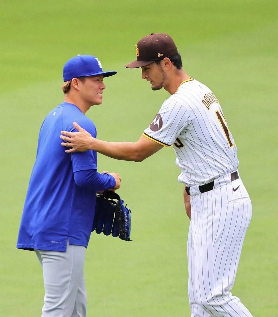 パドレス・ダルビッシュ ブルペン入り後に山本由伸と談笑 13日ドジャース戦で大谷翔平と3度目対決
