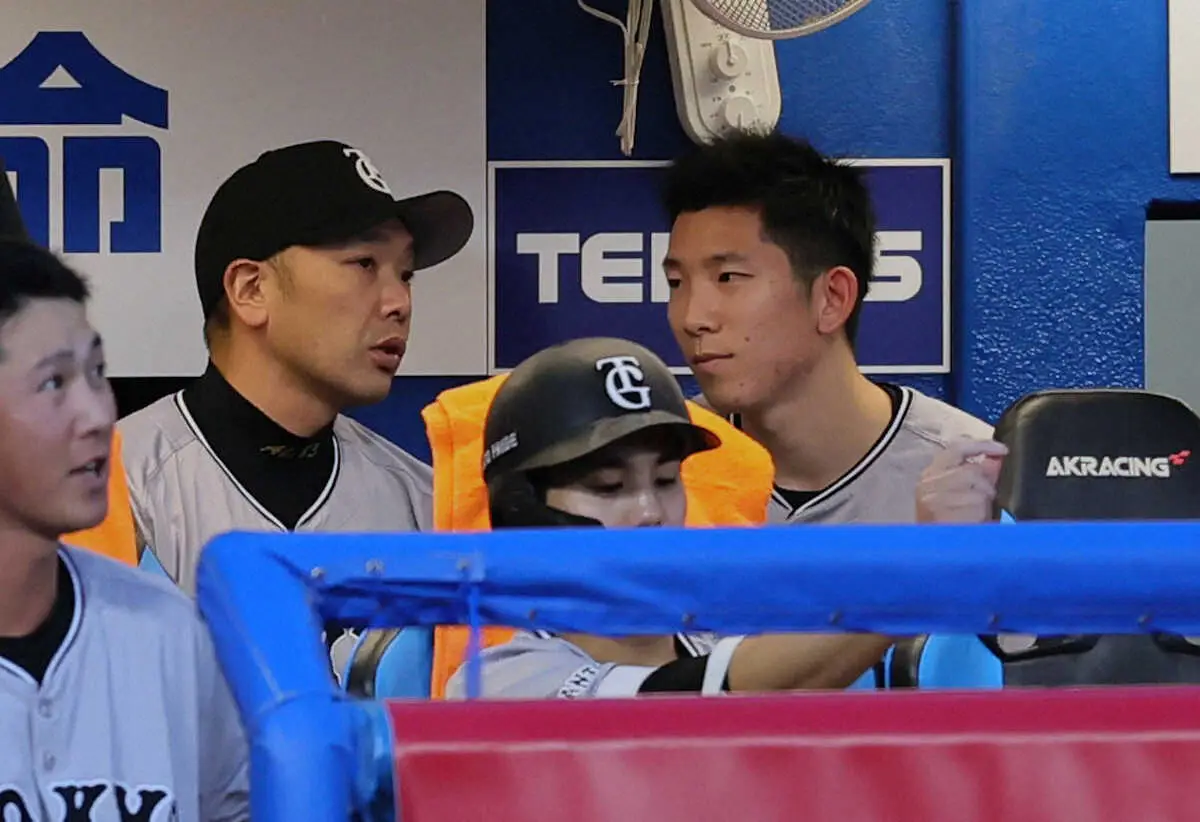 <ヤ・巨>2回終了後、阿部監督(左)と話す戸郷(撮影・尾崎 有希)