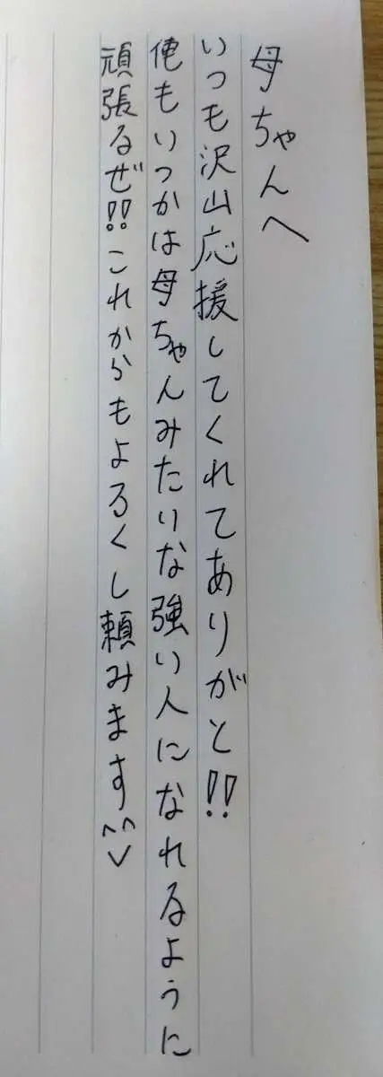 母ちゃん、いつもたくさん応援してくれてありがと!!俺もいつかは母ちゃんみたいな強い人になれるように頑張るぜ!!これからもよろくし頼みます。