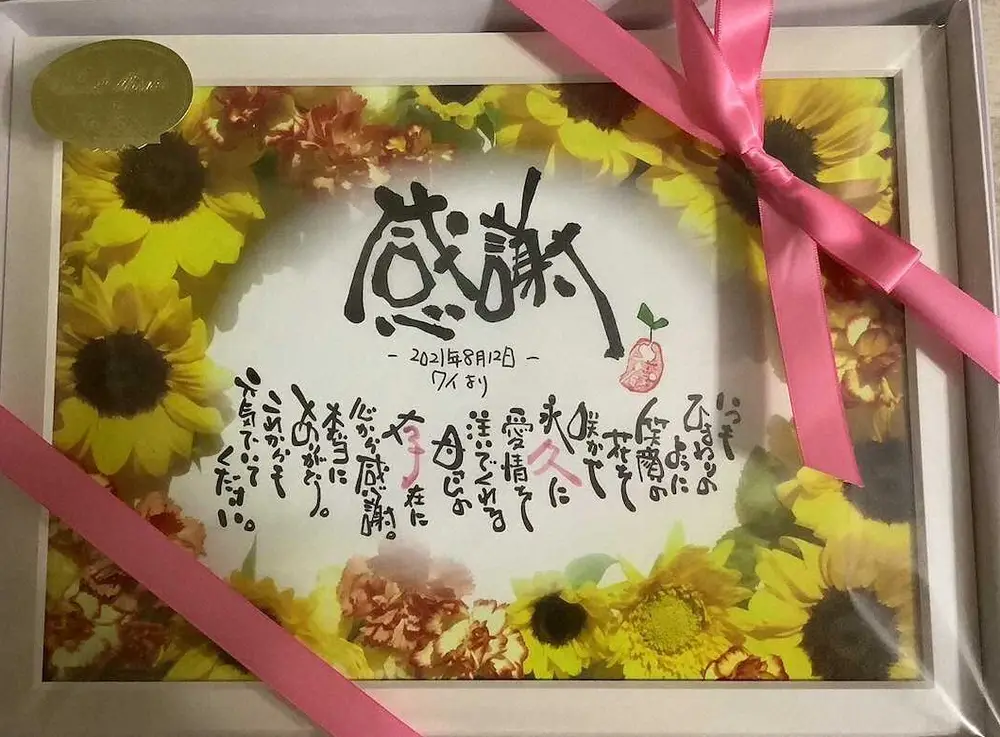 「あんまり覚えてないんですよね~」と母の日に毎年プレゼントを用意してきたわけではない。一方で、久子さんは「一番印象に残っているのは…」と息子からの贈り物をしっかり覚えている。「私の名前の文字を使って感謝の文章にしたものを額に入れてプレゼントしてくれたんです」。数年前、花束と一緒に手渡され今も大切にリビングに飾る。