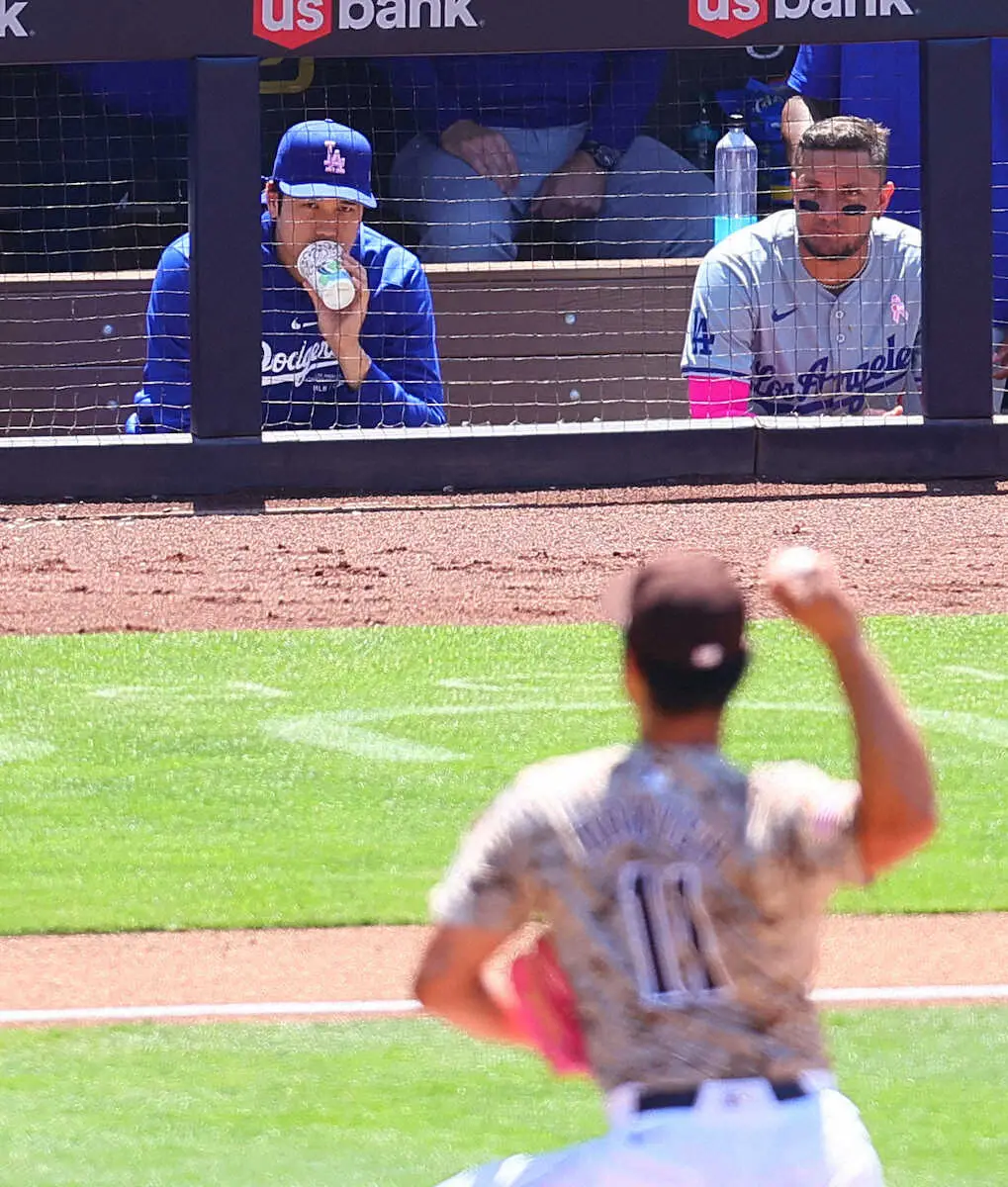 <パドレス・ドジャース>力投するダルビッシュ(手前)を見つめる大谷(左)(撮影・光山 貴大)