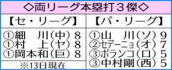 ソフトバンクの山川は13日現在で9本塁打。西武時代の18、19年以来3度目の両リーグ最速10号に王手をかけている。ソフトバンク選手が10号一番乗りとなれば10年オーティズ以来。日本人では61年野村克也以来63年ぶり2人目となる。また、3度目となれば王貞治(巨)の5度に次ぎ、田淵幸一(神)、ブライアント(近鉄)、バレンティン(ヤ)に並ぶ2位タイに浮上。2球団での達成はローズ(02年=近鉄、09年=オ)以来2人目だがどうなるか。きょう14日からは楽天と2連戦。楽天モバイルでは通算25本塁打。本塁打率(打数÷本塁打数)はパ本拠地の中では最も良く、豪快なアーチが飛び出す可能性は高い。