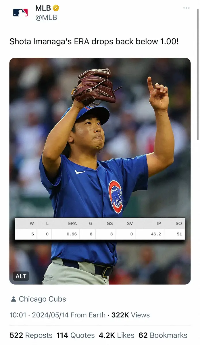 これを受け、MLBが公式Xを更新。天に向かって指をさす今永の画像とともに「ショウタ イマナガの防御率は再び1.00以下に!」とつづった。
