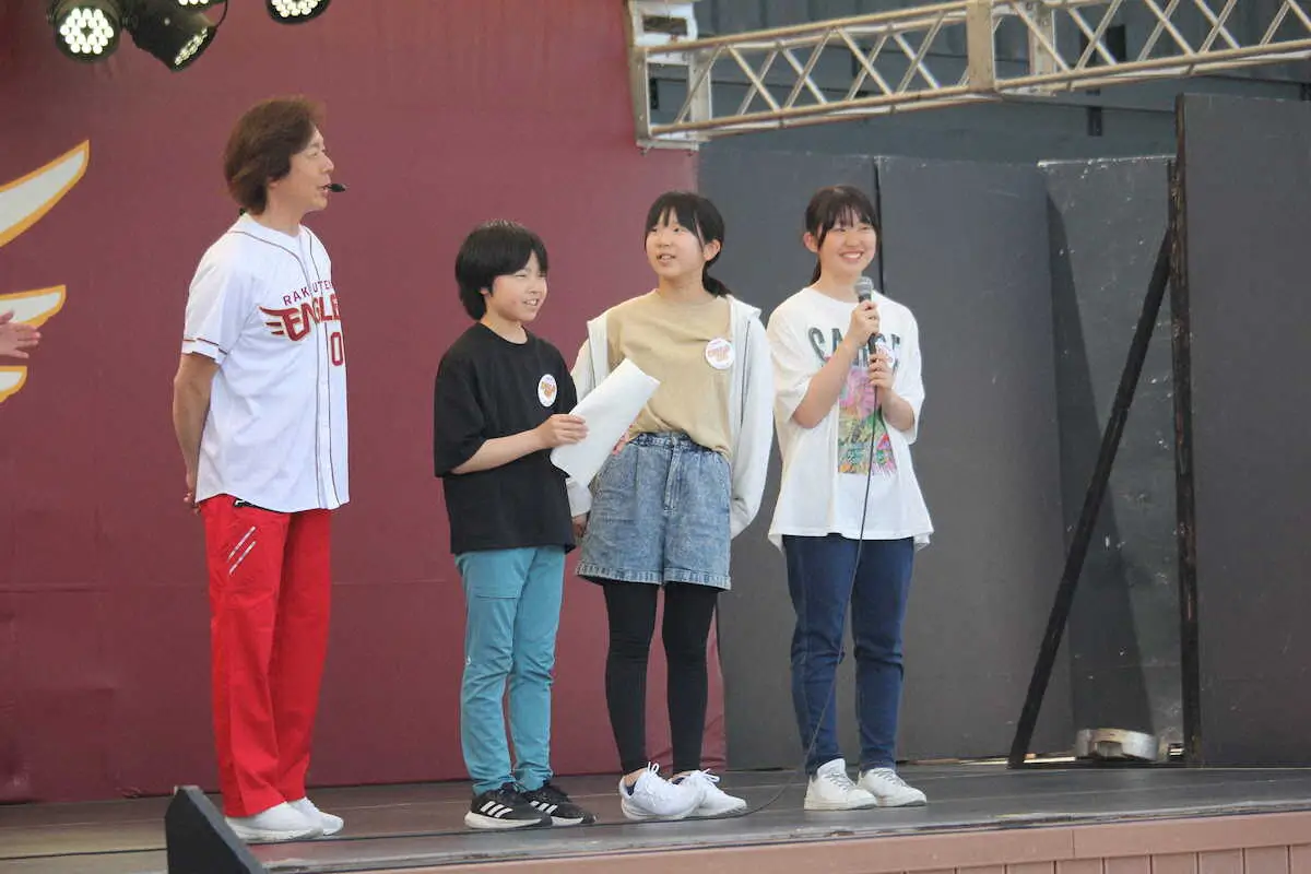 正面広場の「EAGLE STAGE」で補助業務として、仙台市立南材木町小学校の6年生3人が、MCのお手伝いを体験。ステージ上でマイクを通してイベントの進行を行った。永田碧さんは「委員会でもみんなに歌を教えたりしています」と慣れた様子でこなした。岡田彩芭さんは「最初は緊張して、かんだりしたけど、最後は楽しく終われました。やってみて興味が湧きました」と笑顔。何度も観戦に訪れ、岡島、辰己のファンだという弓田達也くんも「みんなの前でしゃべるのが楽しかった。テレビで話したりしてみたい」と続いた。