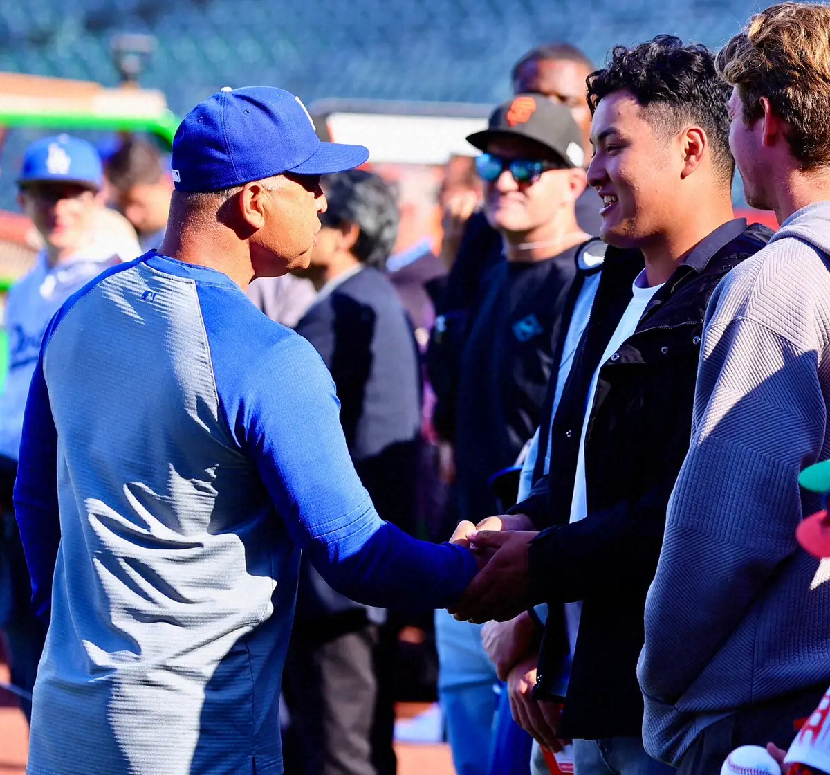 また、ドジャース、ジャイアンツ両球団などでプレーしたMLB通算204勝のオーレル・ハーシュハイザー氏と握手。ジャイアンツファンの子どもからサインをねだられ、応じる場面もあった。