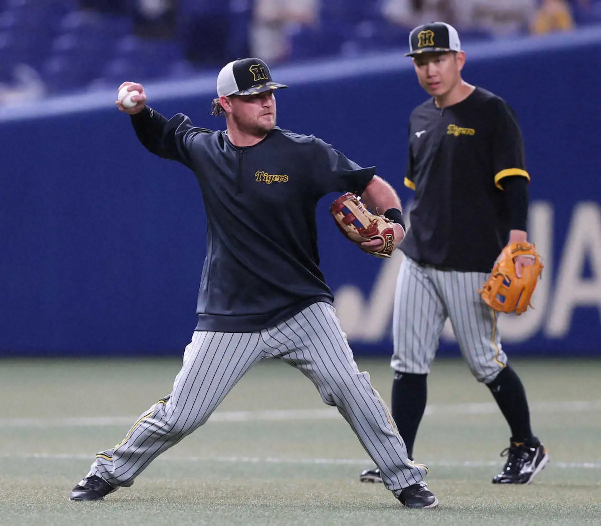 打撃練習を終えると、左翼へ移動し普段通りの打球を捕球した。その後、三塁へ移動。小幡のグラブを借りて糸原、梅野とともに馬場内野守備走塁コーチのノックを受け、軽快な動きを披露した。大学時代は強打の遊撃手として鳴らし、その後は三塁手として活躍。メジャーでは22年には一塁、三塁、遊撃を守った経験もある。