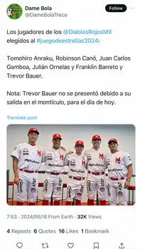 その中には元DeNAのトレバー・バウアー投手の姿も。メジャー復帰を目指すバウアーは、レッドデビルズと短期契約を締結しており、昨年日本球界にいた2人のメキシコでの活躍が期待される。