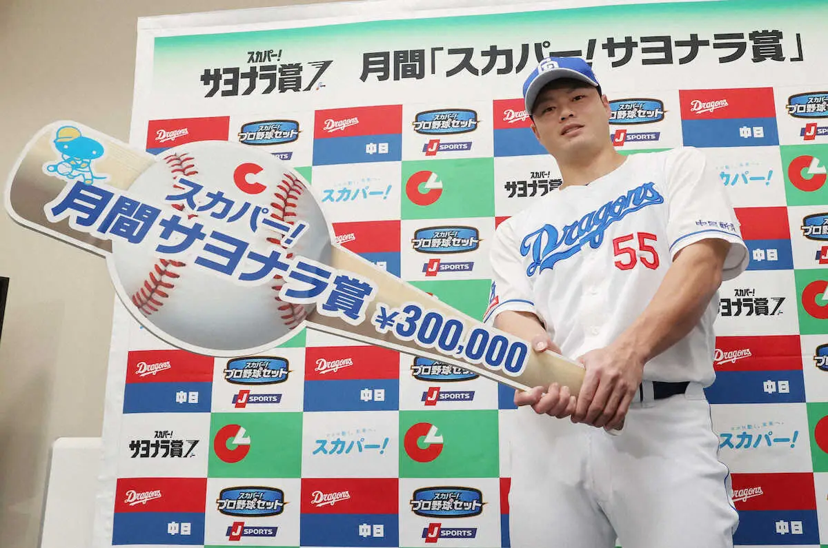 中日の細川成也外野手(25)が16日、3、4月度の「スカパー!サヨナラ賞」を受賞し、バンテリンドームで会見に臨んだ。