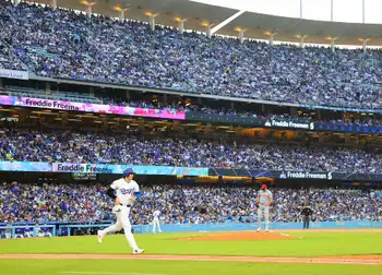 初回の第1打席は変則左腕スーターとの対戦。変則フォームにタイミングを合わせづらそうにしながらもフルカウントからボール球を見極めて四球を選んだ。その後一塁走者としてスーターのけん制球が左太腿を直撃。大谷が苦悶(くもん)の表情を浮かべ、場内からはスーターにブーイングが浴びせられた。しかし、4番T・ヘルナンデスの打席の際に今季11個目の盗塁となる二盗に成功。左太腿直撃の影響を感じさせないプレーを見せた。二盗後は、注目の遊撃手デラクルスと笑顔で言葉をかわす場面も見られた。