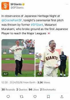 日本人初の大リーガー・村上雅則氏 ジャイアンツの始球式に登場 「マッシー」の愛称で活躍