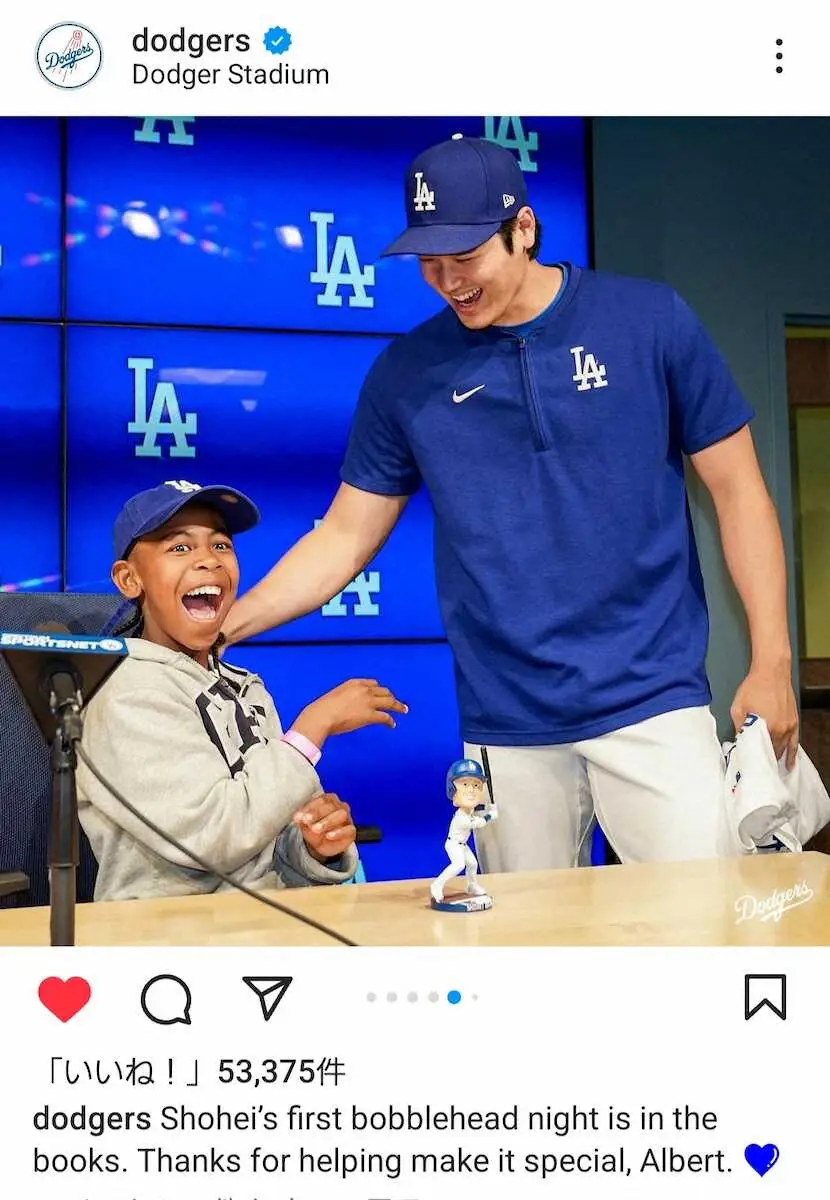 チームではボブルヘッド配布日はモチーフになった選手の夫人が始球式を務めるのが定番だ。大谷は球団から真美子夫人への打診を受けたが、夫婦で話し合い「野球好きな子供や(気軽に)見に来られない病院の子とかの方がいいのではと決めた」と、この日の試合後明かしていた。