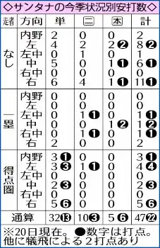サンタナの今季状況別安打数 Photo by スポニチ ヤクルト・サンタナ 23年ぶり開幕から連続月間MVPへ技ありの打法切り替え ギャラリーで見る この記事のフォト 2024年05月21日の画像一覧 もっと見る 2024年05月21日の画像をもっと見る