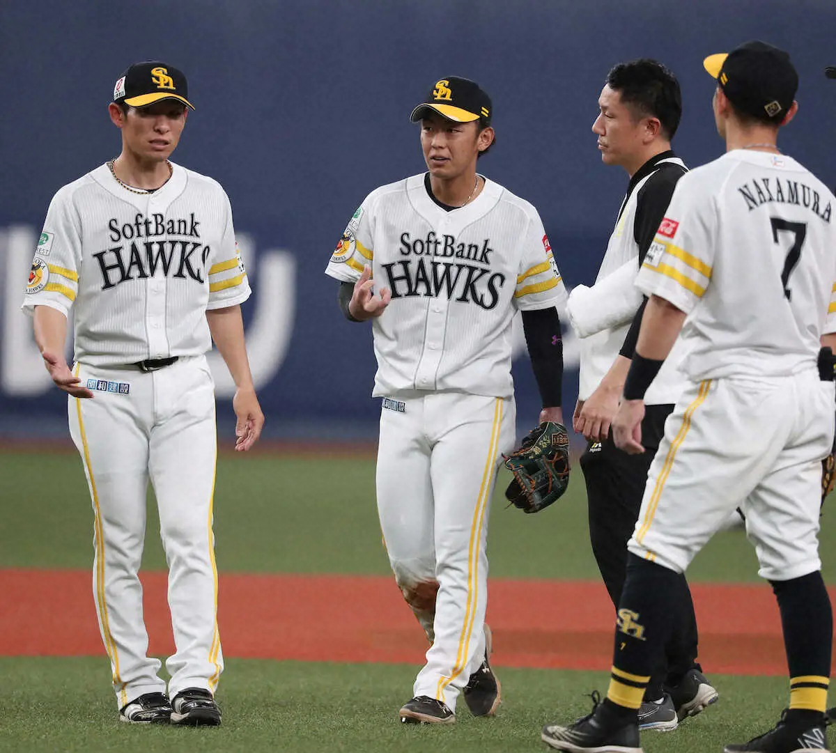 今宮は6回の守備中、右手を痛めてベンチに退いた。遊撃には代わって川瀬が入った。