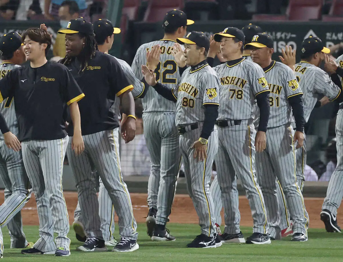セ・リーグ最速で1万試合を達成した阪神が2位・広島に連勝で4カード連続勝ち越しを決め、ゲーム差を2・5に広げた。貯金も今季最多の「7」となった。初回に大山が2試合連続で先制打を放つと、先発の西勇も6回3安打無失点の好投。7回に森下の犠飛で加点すると、終盤は8回、そして9回と中野が再三の好守で1点差を逃げ切った。1点差の9回1死一、三塁で前進守備を取らずに併殺で切り抜けた岡田監督も「あそこはゲッツー態勢。同点までOKよ。4カード連続初戦負けやん。もうちょっと楽にゲームをせんと」と試合を振り返り、1万試合についても「そんなん知らん」と無関心を装った。以下は一問一答。