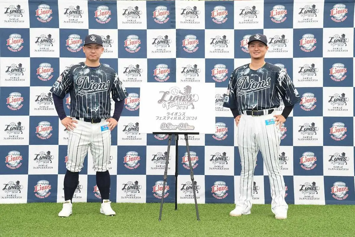 埼玉県所沢市出身のクリエーティブディレクター・相沢陽介氏(46)がデザインしたストライプのユニホームで夜行性のライオンが最も活動的になる月明かりの夜空をイメージした青色。モデルを務めた佐藤龍は「ストライプは新鮮でかっこいい」と目を輝かせた。