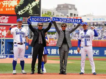 「あぶ刑事」舘ひろしと柴田恭兵が「ドラマチック」にハマスタ登場!ユージが筒香斬り 72歳に大歓声