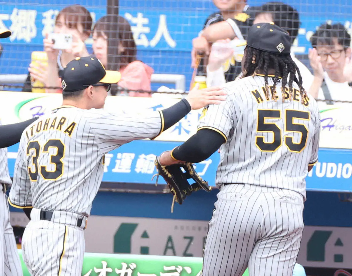 ベンチに帰ってきた助っ人に反応したのは糸原。ミエセスの背中を優しくパンチすると、三塁側に詰め掛けた虎党は手を叩いて盛り上がった。ミエセスは才木に一声かけ、右腕からは背中をポンポンと叩かれた。
