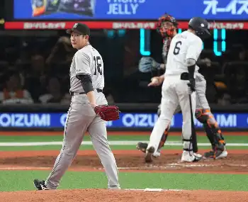 ピンチを迎えても配球の妙で点を与えない。3回2死三塁、打席に源田。フルカウントになってから、粘っこい源田をどう攻めるかと思ったら6球目内角にズバッと153キロ直球。ファウルを取ると最後は外角に129キロカーブで空振り三振。緩急とコースを駆使した配球に源田はお手上げだった。