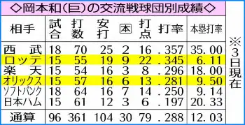 きょう4日からは本拠地・東京ドームでロッテ、オリックスとの6連戦が予定されている。岡本和の交流戦通算本塁打は30本。ロッテ戦は球団別最多の9本塁打でオリックス戦も3番目に多い6本塁打をマークしている。