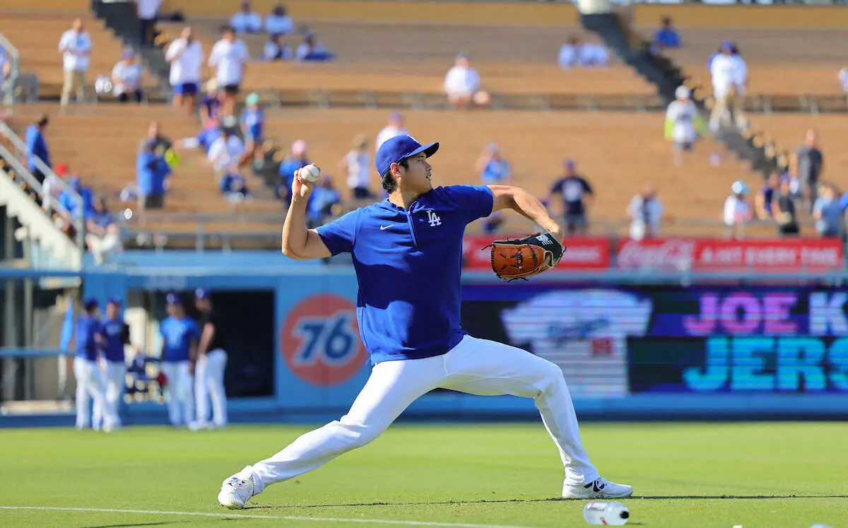 来季の投手復帰を目指すドジャース・大谷は、試合前にグラウンドで約20メートルの距離で70球のキャッチボールを実施。終了後はベンチ前に集まっていたファンへのサインに応じていた。