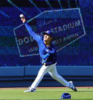 ドジャースタジアムでキャッチボールをする山本由伸(撮影・光山 貴大)