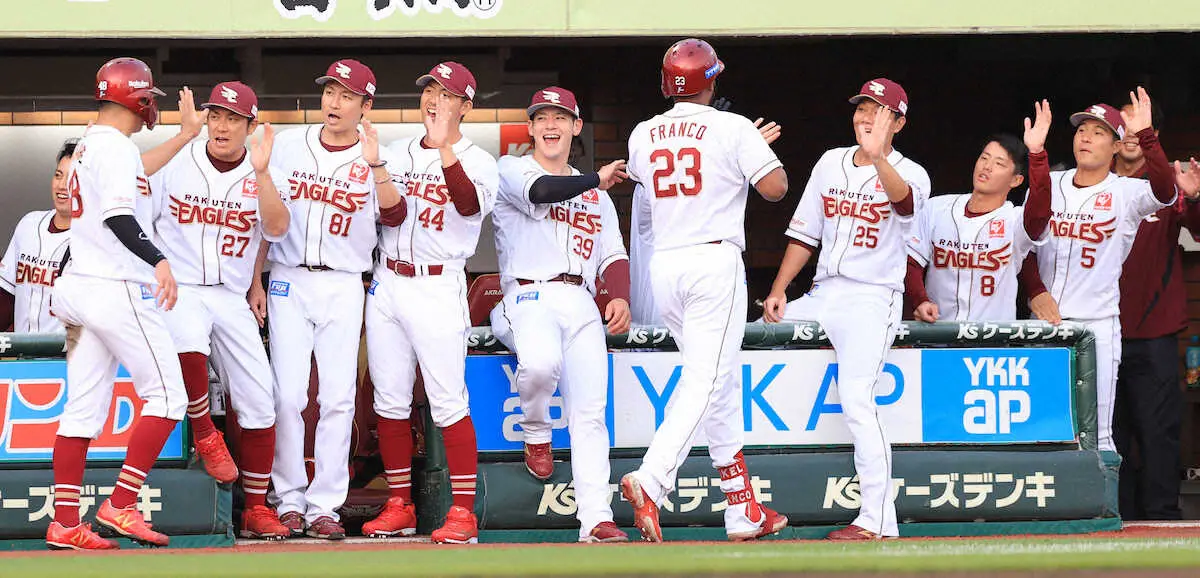 <楽・巨>初回、3ランのフランコを出迎える楽天ナイン(撮影・西川 祐介)