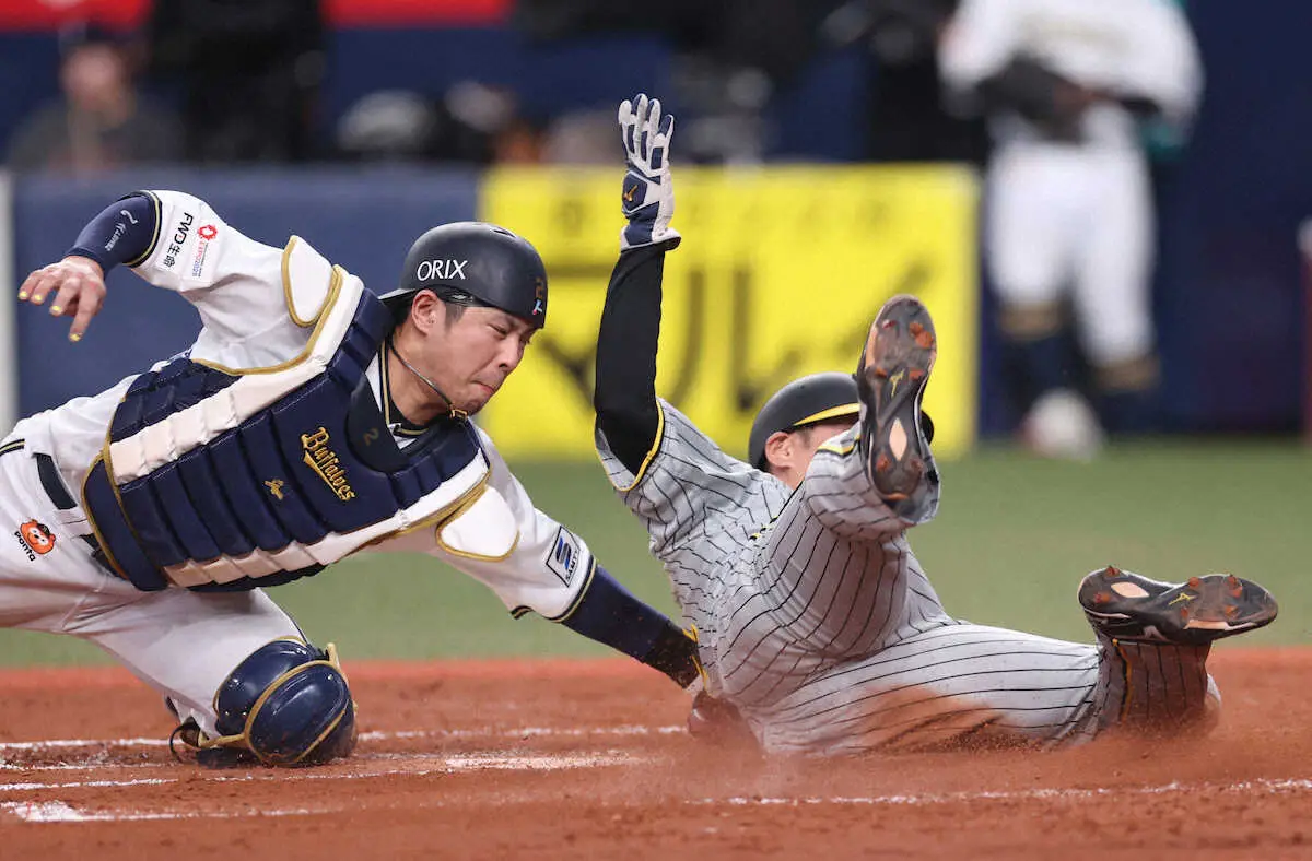 0―0で迎えた4回1死二、三塁。梅野の遊ゴロで三走・原口が本塁へ突入。ゴロを捕球したオリックス・紅林のワンバウンド送球がやや一塁側に逸れたスキを見逃さず、原口が左手を必死に伸ばしてベースタッチ。セーフの判定に、オリックスベンチがリクエストを要求するも、ジャッジは変わらなかった(記録は紅林の野選)。