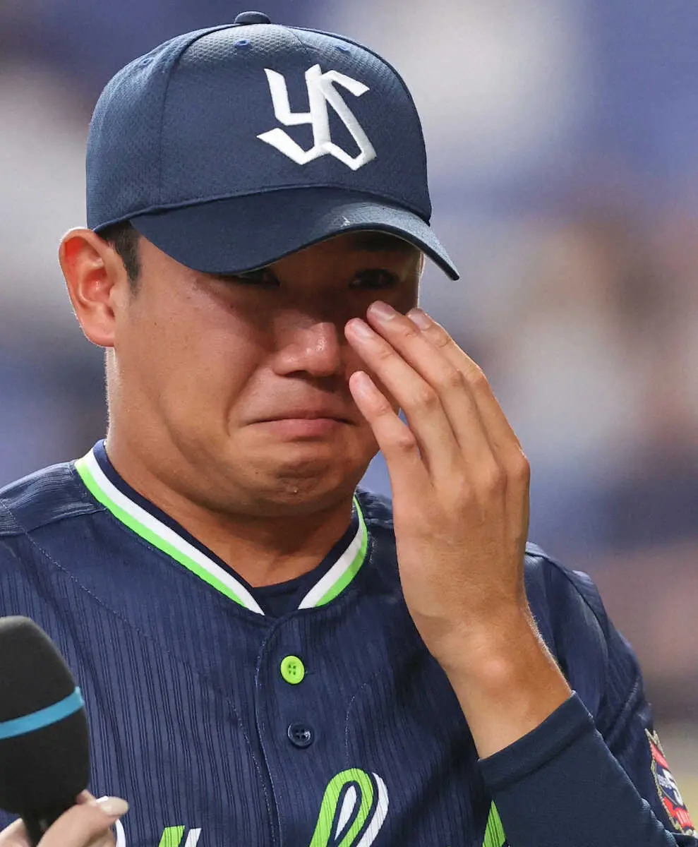 涙があふれ、言葉が出てこない。ようやく「ファンの皆さんの温かい声援をいただいて…本当に…うれしかったです…」。ユニホームで涙を拭いながら声を絞り出した。