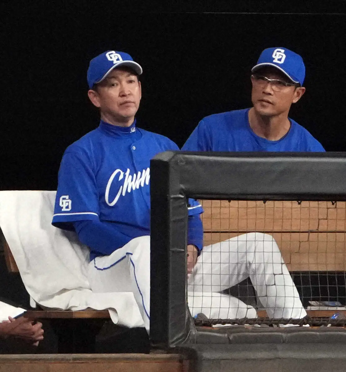 <日・中>ベンチで試合を見守る立浪監督(撮影・高橋 茂夫)