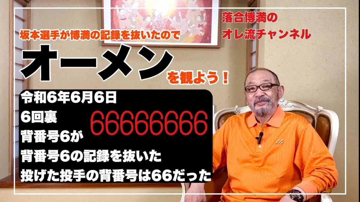 現役時代に3冠王を3度獲得し、監督としては中日を4度のリーグ優勝に導いた落合博満氏(70)が17日、自身のYouTube「落合博満のオレ流チャンネル」を更新。今月6日に東京ドームで行われたロッテ戦で自身のプロ野球通算2371安打を抜く2372安打目を放った巨人の坂本勇人内野手(35)にちなみ、6月6日午前6時に誕生した悪魔の子・ダミアンを描いたホラー映画「オーメン」を鑑賞した。