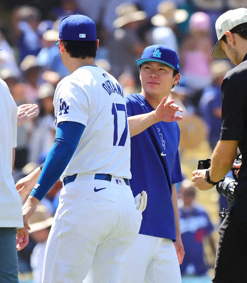 <ドジャース・ロイヤルズ>勝利しタッチする山本(右)と大谷(撮影・光山 貴大)