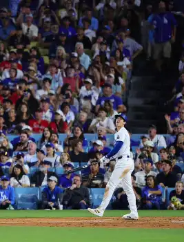 ドジャースタジアムが大熱狂に包まれたのは5回の第3打席だった。5回2死一塁で、カウント1―1から左腕ムーアの甘い速球を強振。打球速度113.1マイル(約182.0キロ)、27度の角度で上がった中堅への特大の一発は455フィート(約138.6メートル)の特大弾となった。飛距離は今季3番目の当たりだった。大谷は笑顔でダイヤモンドを一周すると、ベンチ内でナインに祝福を受けた。