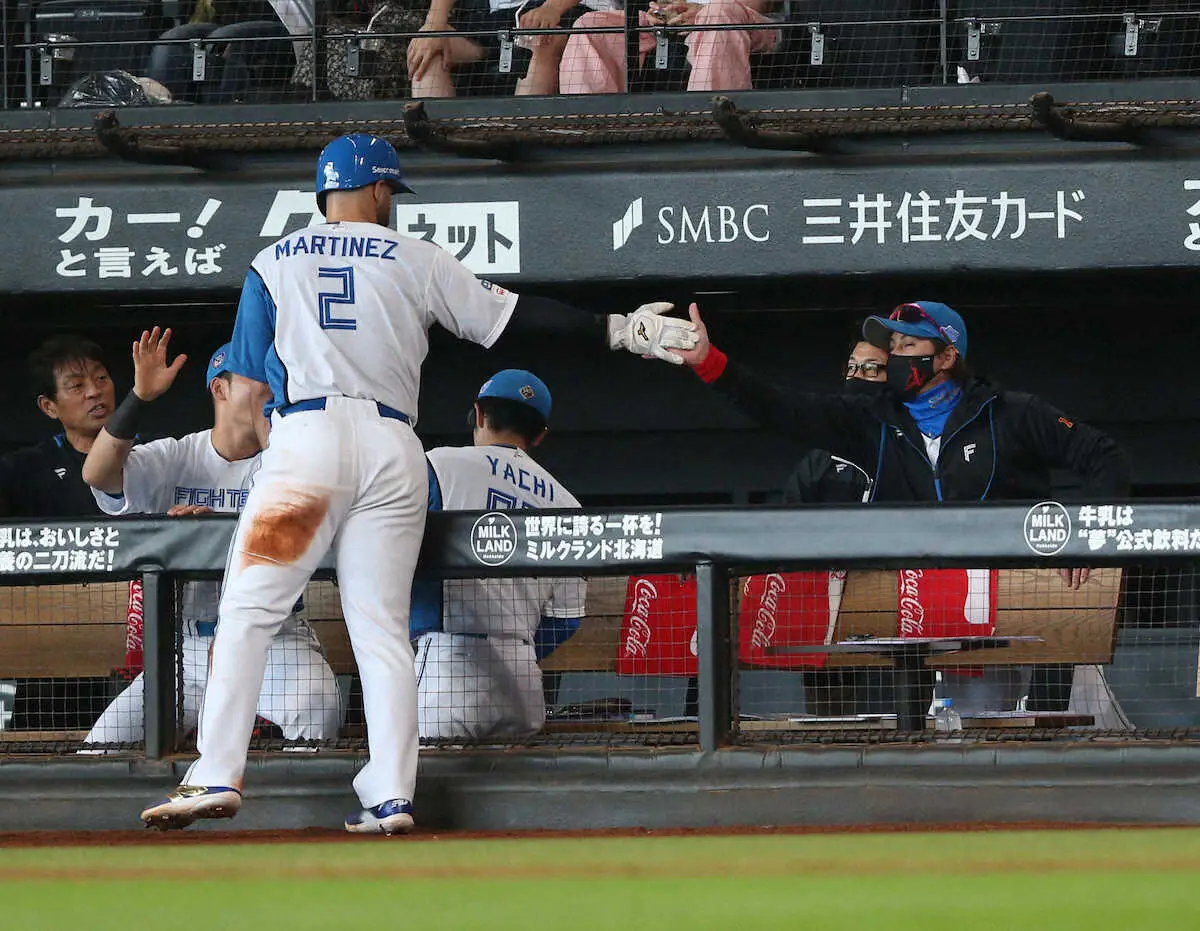 <日・楽(10)>4回、郡司の内野安打で生還したマルティネスを出迎える新庄監督(撮影・高橋 茂夫)