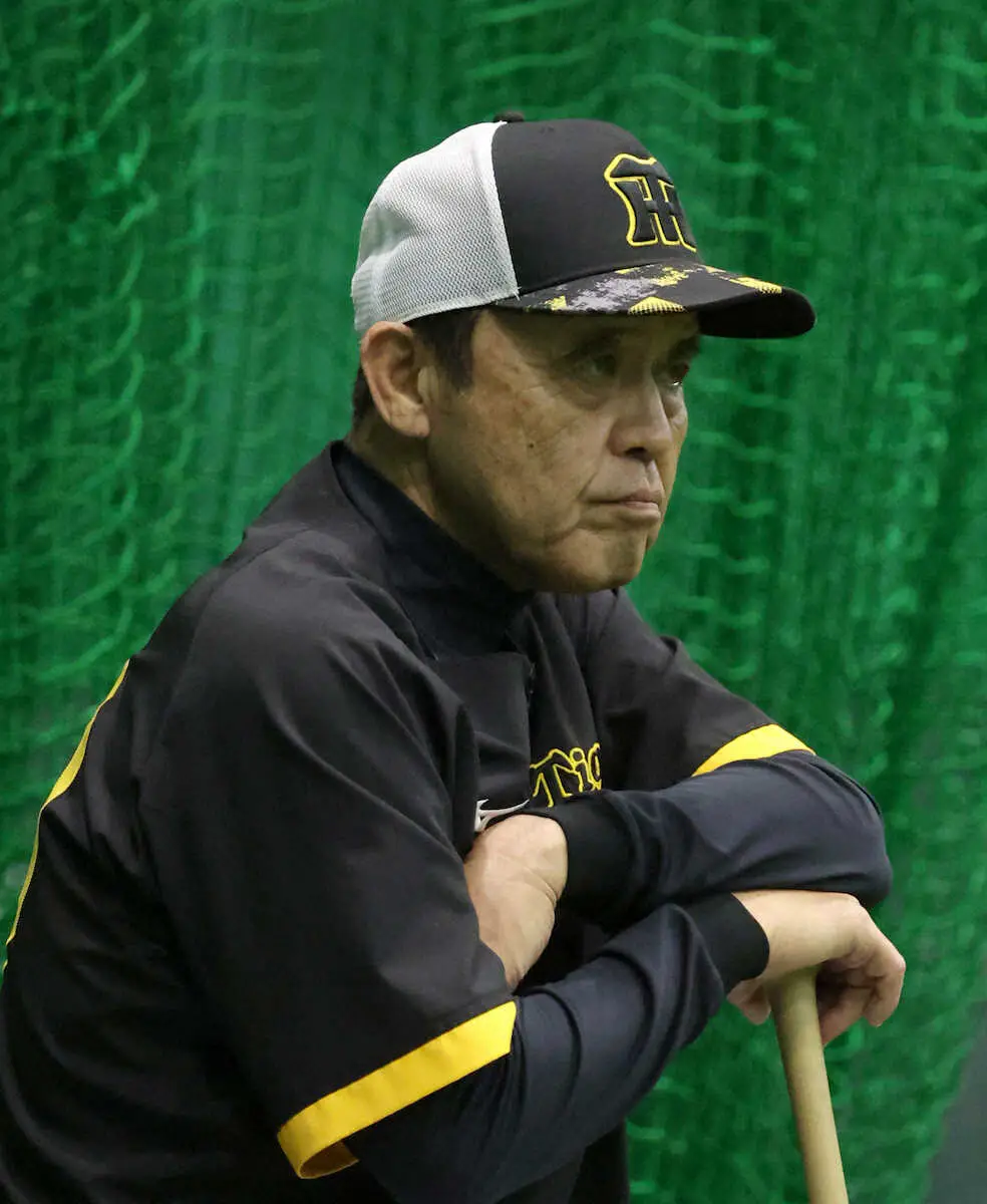 練習を見守る阪神・岡田監督(撮影・後藤 正志)